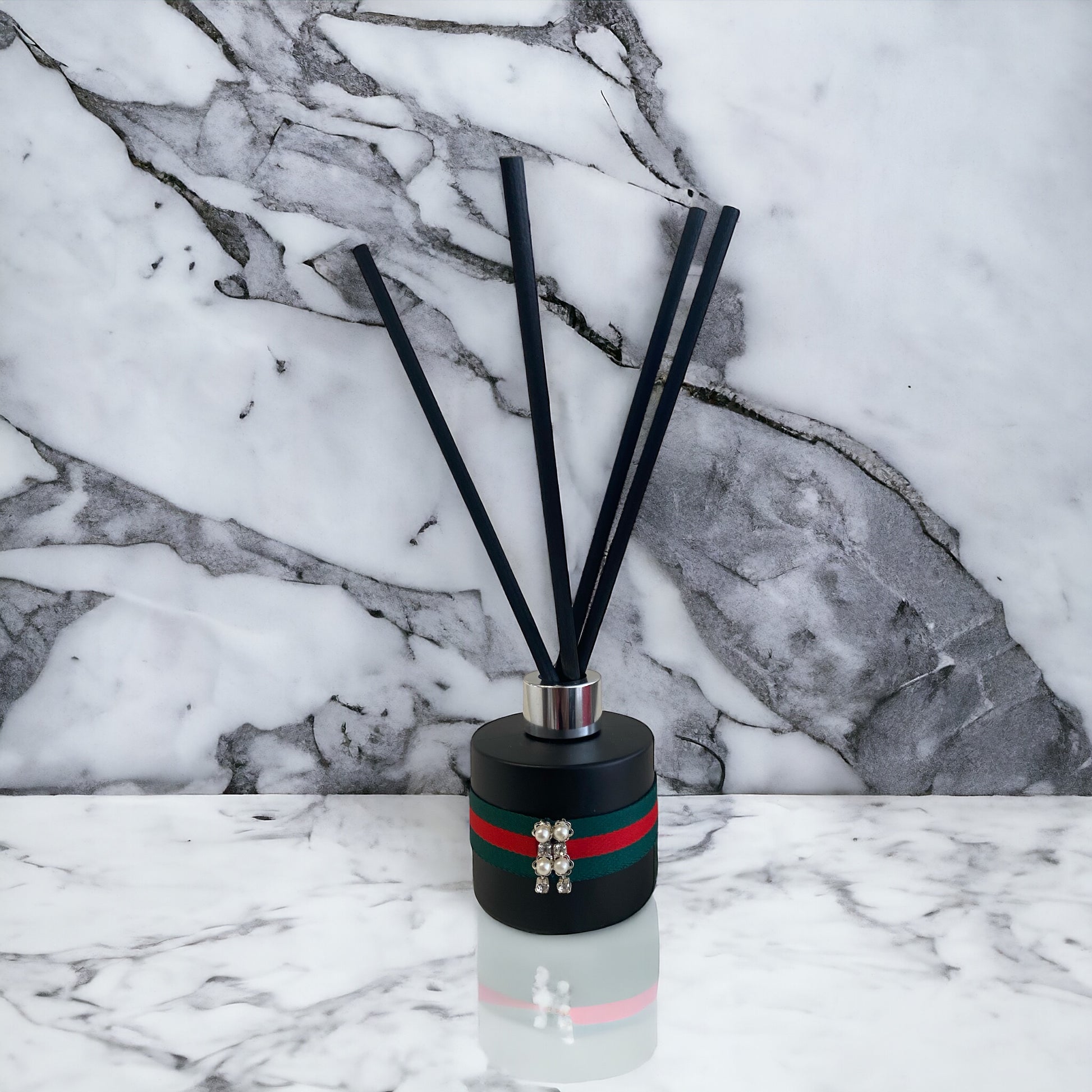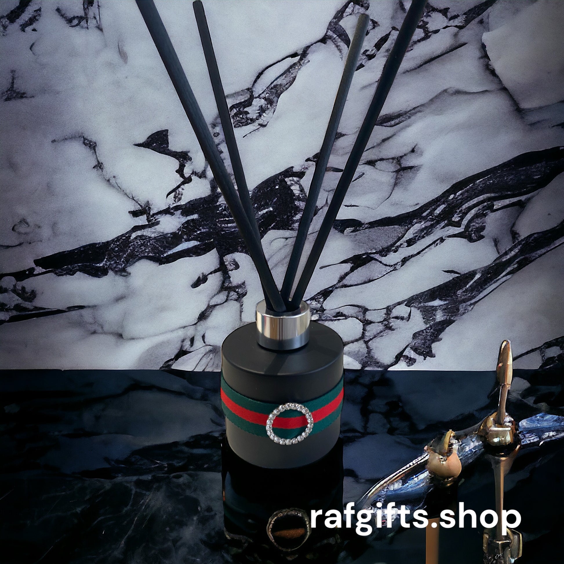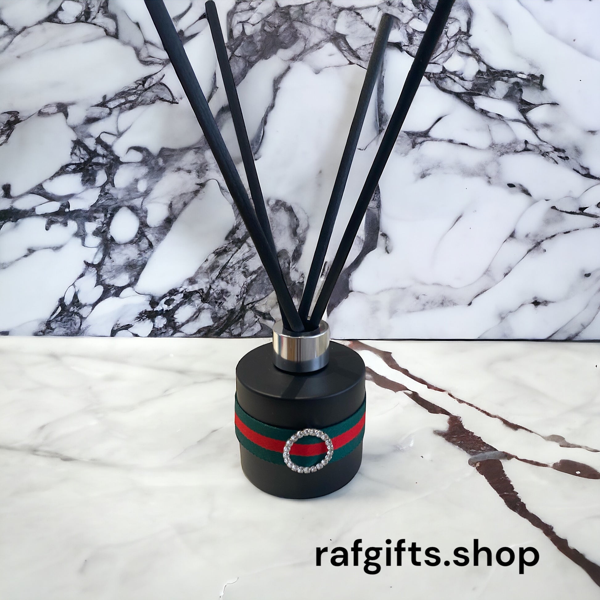 Enhance your space with our stunning diffuser bottle, adorned with vibrant colours. Red & Green with a sparkling circle gem.